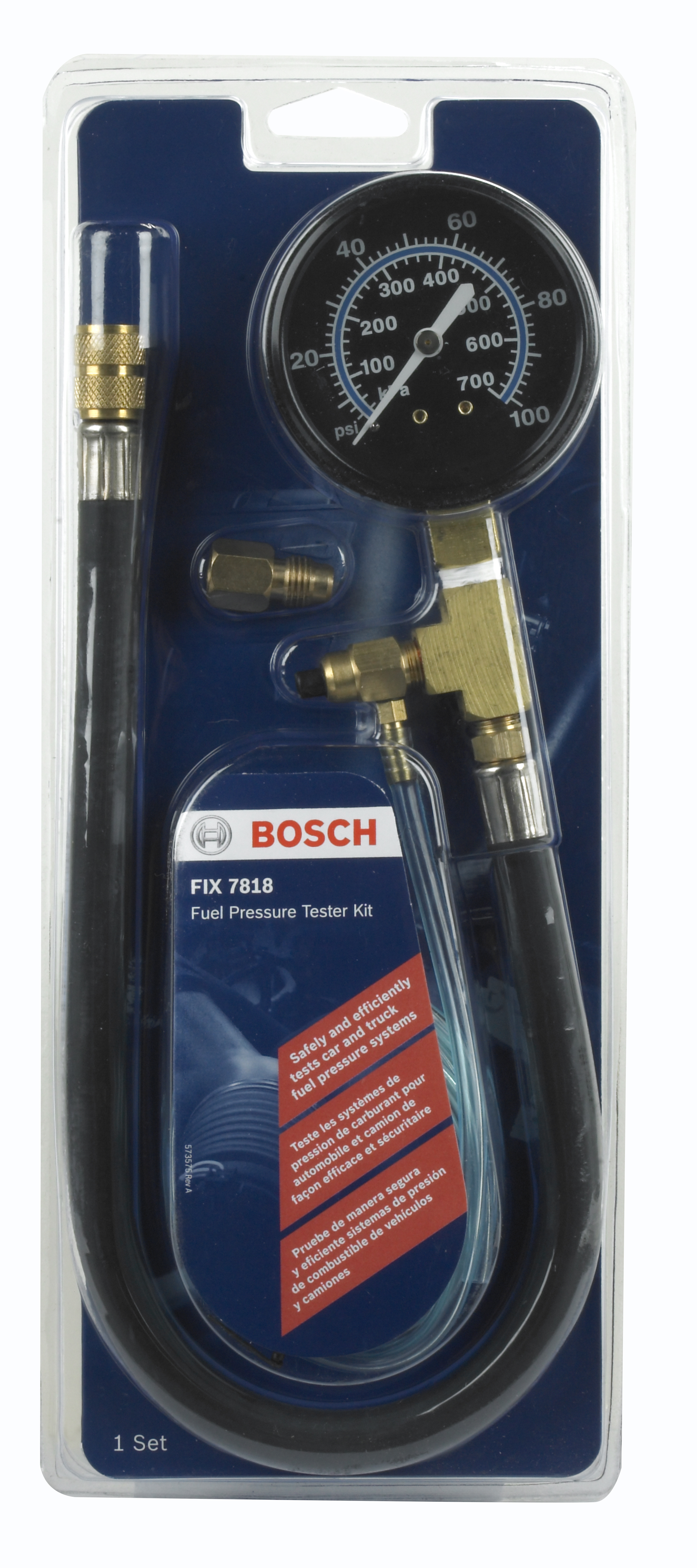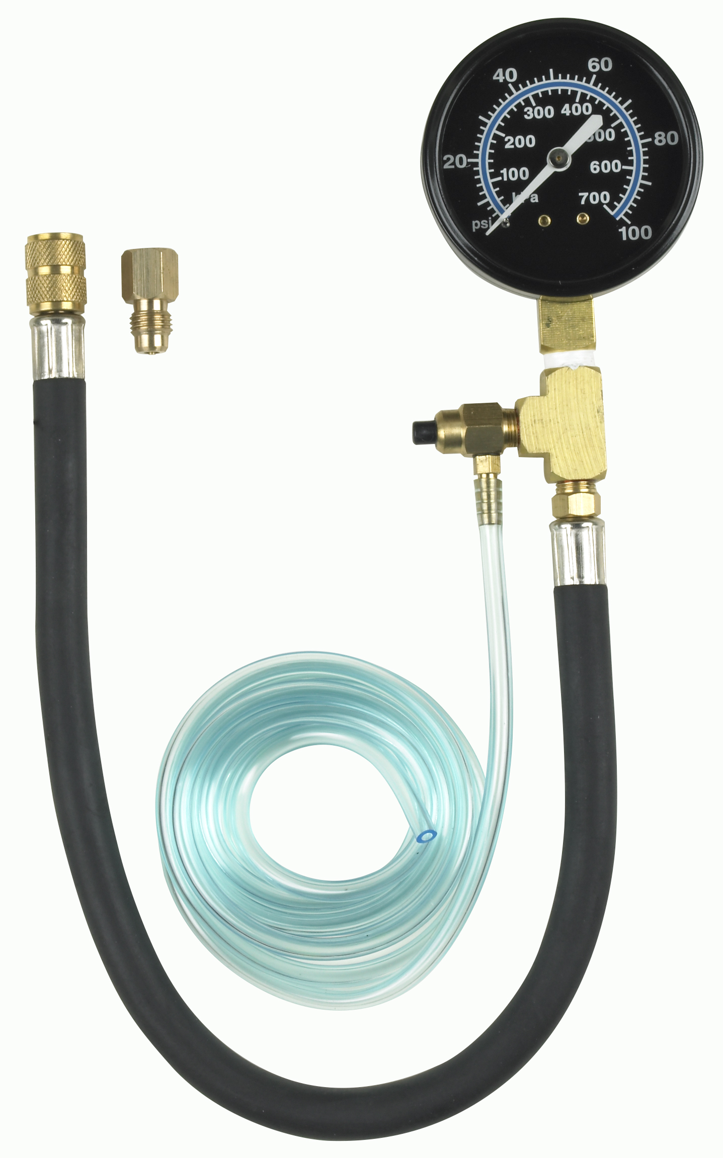 Safely test car and truck fuel pressure systems equipped with a Schrader or fuel access valve test port on the fuel line.