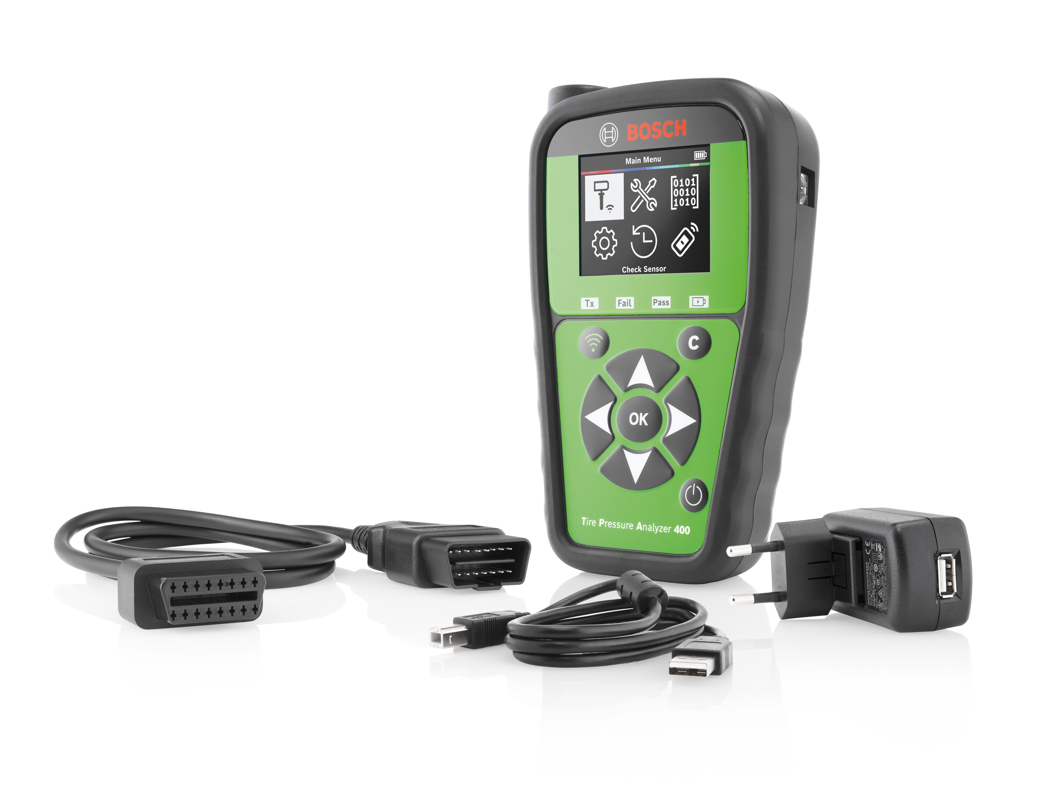 The Bosch TPA 400 Tire Pressure Analyzer is a powerful TPMS service tool designed to help technicians diagnose, program, and service tire pressure monitoring systems across Asian, Domestic, and European vehicles. With an integrated OBD II module, the TPA 400 can reprogram more than 90% of vehicles directly through the OBD port, helping shops complete TPMS service faster and more efficiently.