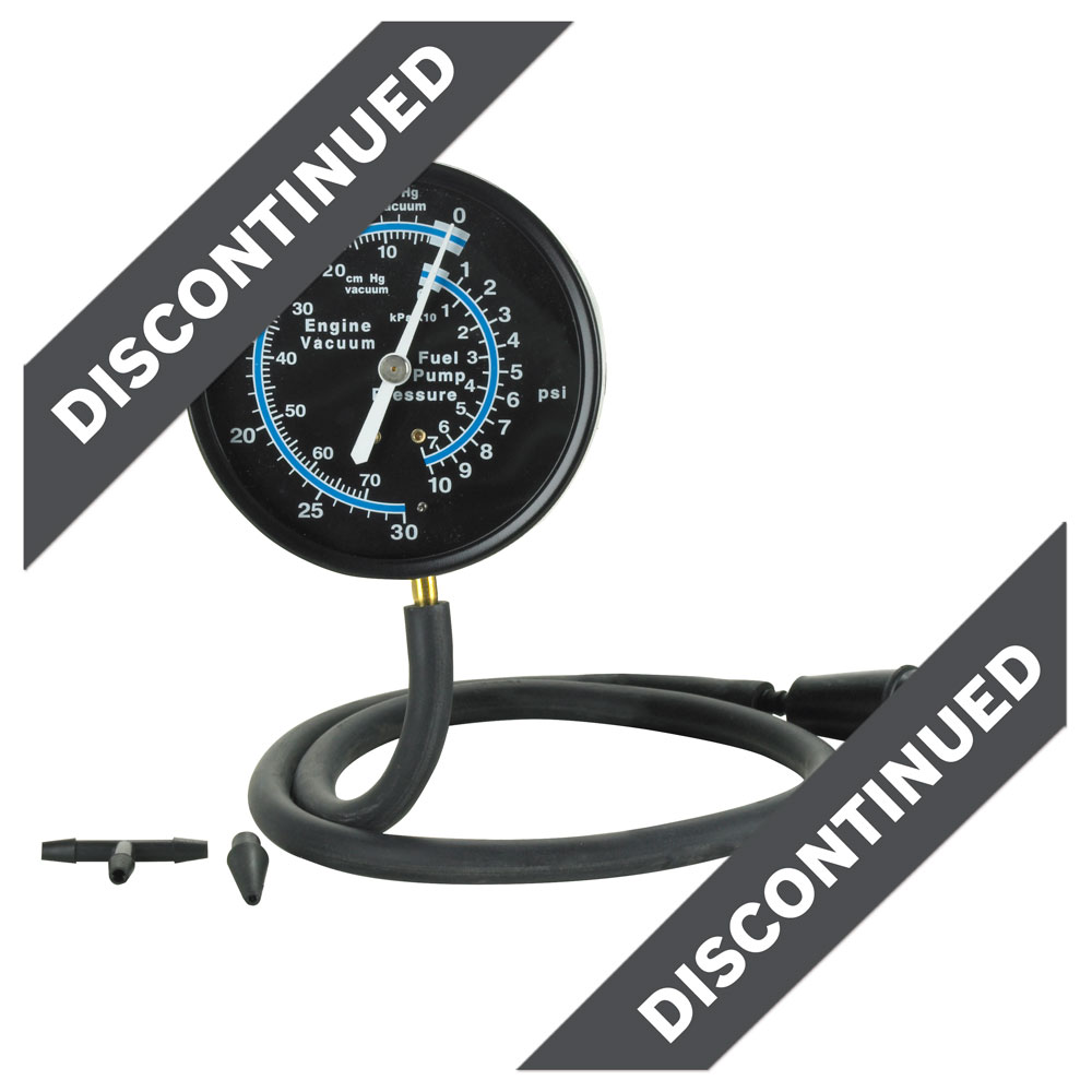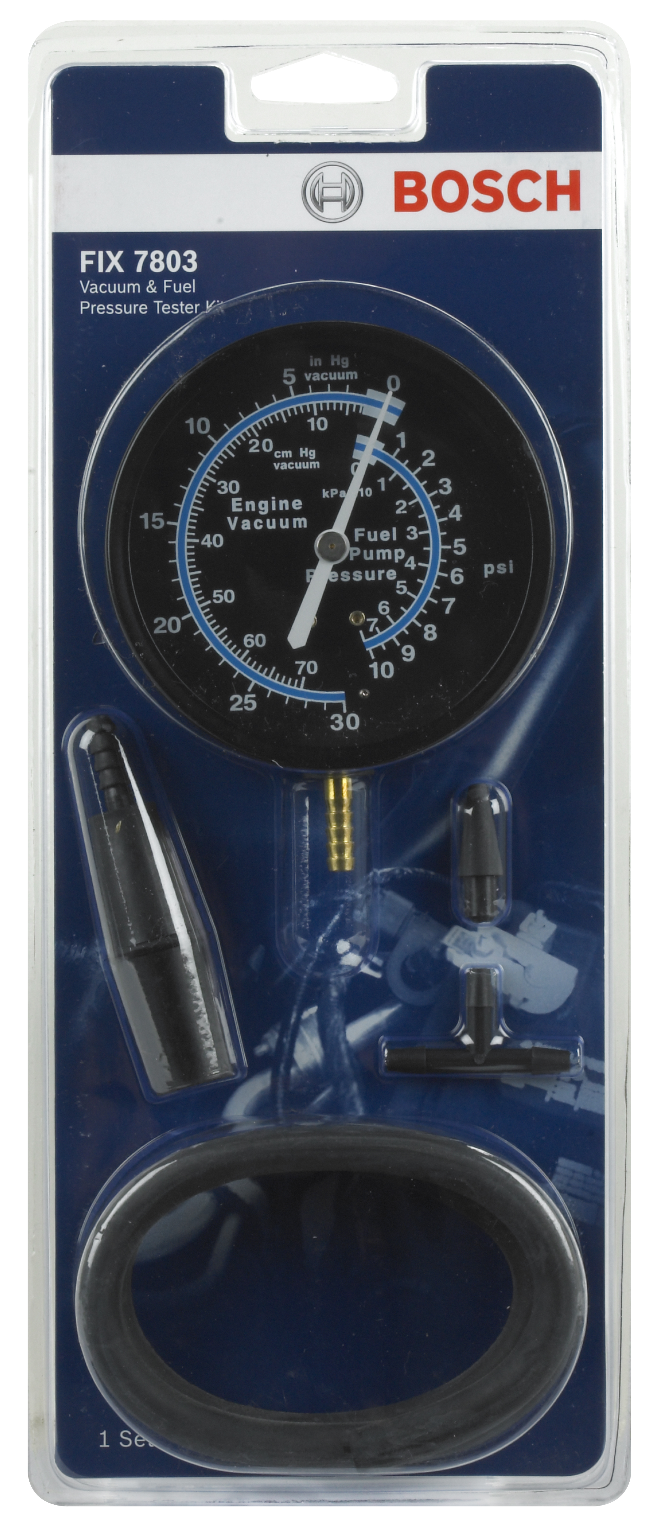 Bosch's FIX 7803 Vacuum and Fuel Pressure Tester Kit is a great way to fine tune carburetion and timing for peak performance and maximum fuel economy. Use to test fuel pump pressure, mechanical condition of the engine, vacuum control system function, and much more. This versatile tool finds intake manifold leaks, blown manifold and head gaskets, worn piston rings, burned valves, and leaking vacuum lines on conventional and computer-controlled vehicles. The easy-to-read, 3-1/2 inch diameter gauge face displays 0-30 inches vacuum (0-70cm) and 0-10 pounds (0-70 kPs) of pressure in both standard and metric scales. Includes gauge, hose, multiple adapters, and detailed usage and testing instructions. NOTE: fuel system functions are for carbureted engines only - not for use on fuel injected vehicles! 1 year warranty.